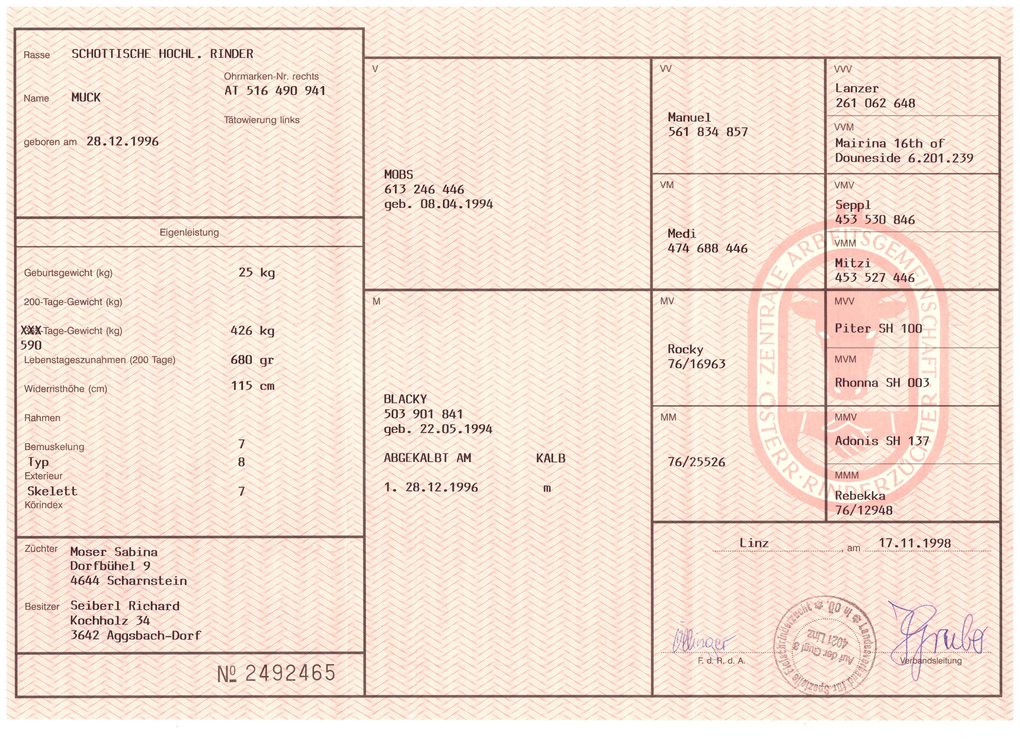 Von 1998 bis 2006 stand der „Hochlandrinder Bundessieger 1998“, der schwarze Muck bei uns im Deckeinsatz. Weibliche Nachkommen von ihm bilden noch immer einen wesentlichen Grundpfeiler in unserer Zucht.