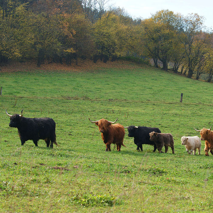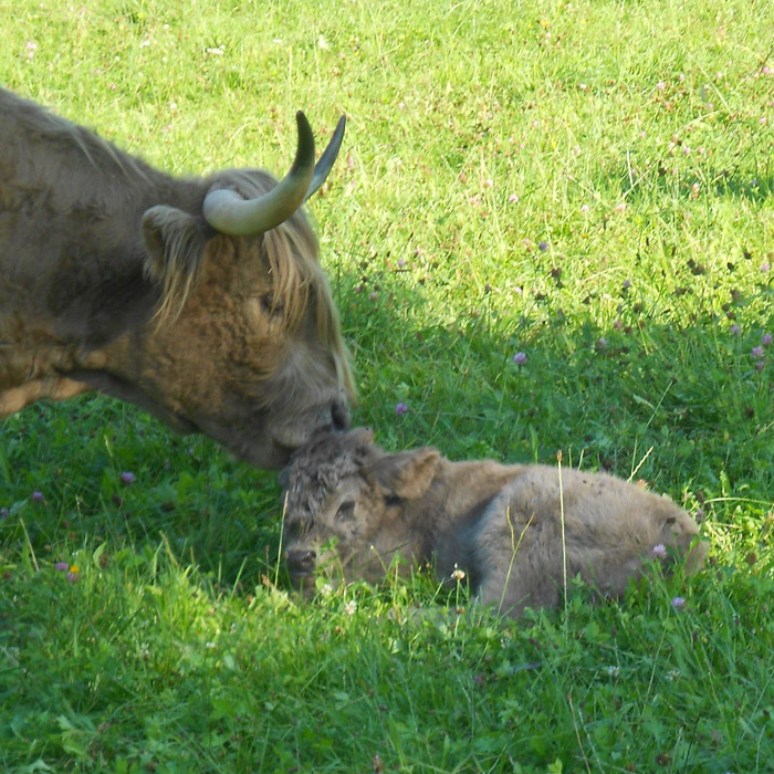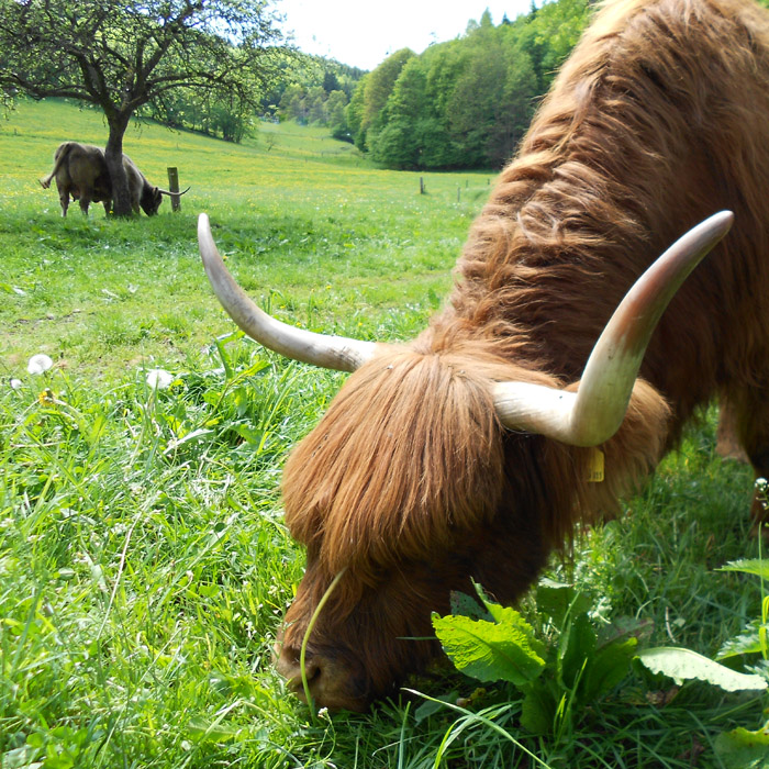 Die biologische Bewirtschaftung unserer Wiesen und Felder, die ganzjährige, extensive Freilandhaltung unserer Hochlandrinder und die intensive Betreuung der Herde zeichnen die qualitativ hochwertigen Zuchttiere und die daraus gewonnenen Produkte aus.